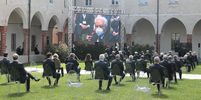 E’ stata quindi la volta del Presidente Mattarella, che si è complimentato “per questo splendido recupero e per questo sforzo collettivo. I Monasteri, nell’Alto Medioevo, erano propulsori della rinascita, e per questo essere qui ha un significato simbolico. Questo straordinario complesso si è trasformato in un suggestivo campus frutto di collaborazione tra pubblico e privato. Condizione preziosa anche in via generale, non soltanto in questa circostanza: particolarmente in questo momento la collaborazione fra tutte le realtà del Paese è indispensabile per definire nel modo migliore, per attuare sollecitamente e con efficienza i programmi che conseguono dal Next Generation dell’Unione Europea.