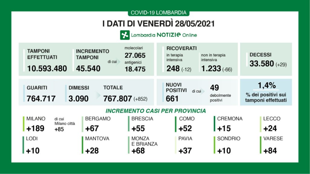 Per quanto riguarda le altre province, a Milano sono stati segnalati 189 contagi, a Monza 68, a Varese 84, a Como 52, a Brescia 55, a Bergamo 67, a Lecco 24, a Mantova 28, a Lodi 10, Pavia 37 e a Sondrio 10.