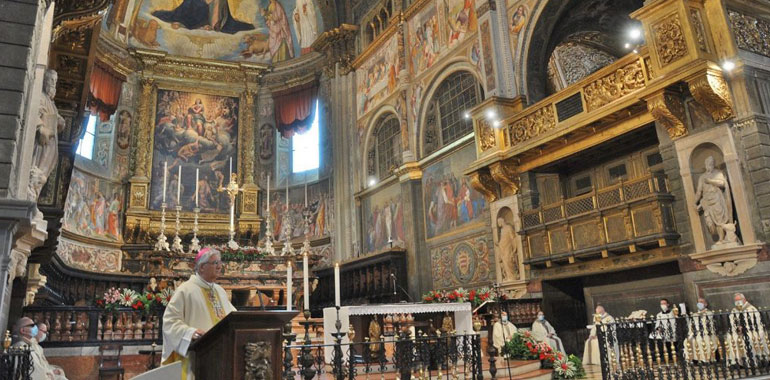 «È bello venire in chiesa ma ci viene ricordato che la nostra vita, il nostro povero corpo sono il tempio del Signore – ha riflettuto il vescovo Napolioni aprendo la sua omelia – a Cremona questa espressione brilla particolarmente perché la bellezza della nostra Cattedrale è davvero motivo di grande gioia per tutti: credenti e non credenti, commercianti e turisti, pellegrini e canonici, vescovo e popolo santo di Dio, perché davvero custodisce un segreto che è quello della bellezza, che è certamente frutto di mani sapienti ed esperte, di coraggio architettonico, di perizia pittorica ma è una bellezza che rispecchia un amore, che racconta un’esperienza, che mette in contatto con la fonte della vita. Questa festa dell’umano è in realtà il frutto di Dio».