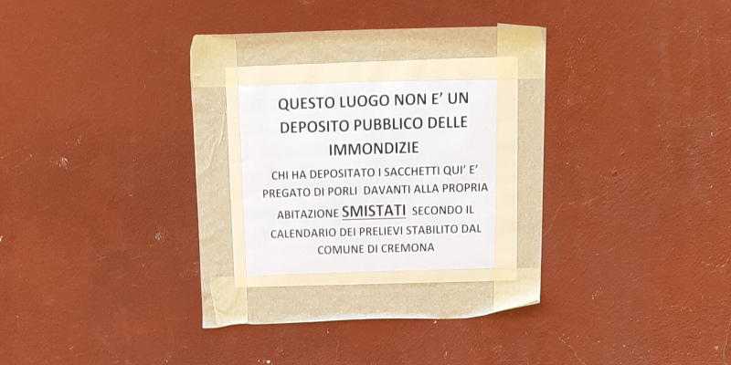 le invio una fotografia scattata in via Oscasali, dietro alla chiesa di Sant’Omobono. Un cittadino indispettito ha messo un cartello per ricordare agli incivili le regole minime per una raccolta dei rifiuti corretta.