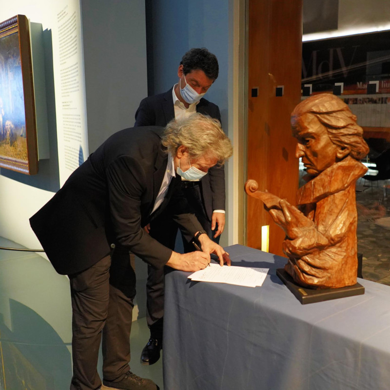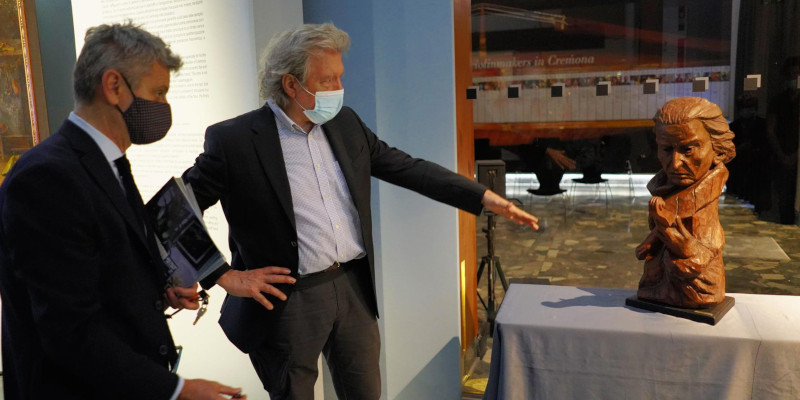 Accanto alla ricerca storico liutaria. il Museo del Violino ha da anni promosso una indagine in ambito iconografico su Antonio Stradivari. In una sezione dedicata del percorso di visita sono dunque presentati, a cura del conservatore Fausto Cacciatori, ritratti coevi e postumi del Maestro. Stamattina a questa collezione si sono aggiunte due nuove sculture. Antonio Lazzari ha infatti donato al Museo un busto ligneo di Stradivari opera dal padre Camillo e uno, in ceramica, realizzato da Pietro Foglia.