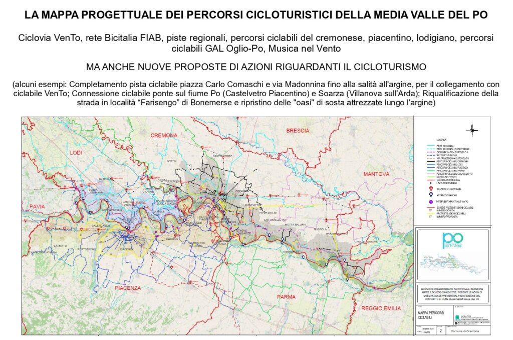 Il programma di azione è il vero e proprio “corpo” del Contratto di Fiume, in quanto riporta l’insieme delle proposte progettuali riconducibili a tre ambiti tematici: qualità e sicurezza del fiume; tutela e uso sostenibile del territorio fluviale; promozione e valorizzazione turistica. Il Programma d’Azione si compone di 94 proposte di azioni. Di particolare rilevanza è la mappa progettuale dei percorsi cicloturistici della Media Valle del Po: Ciclovia VenTo, rete Bicitalia FIAB, piste regionali, percorsi ciclabili del cremonese, piacentino, lodigiano, percorsi ciclabili GAL Oglio-Po, Musica nel Vento, ma anche nuove proposte di azioni riguardanti il cicloturismo quali, solo per citarne alcune, il completamento della pista ciclabile piazza Carlo Comaschi e via Madonnina fino alla salita all’argine, per il collegamento con la ciclabile VenTo, la connessione della ciclabile sul ponte sul fiume Po (Castelvetro Piacentino) e Soarza (Villanova sull’Arda).