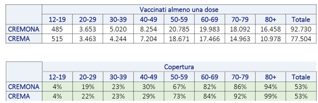 Secondo l’ultimo report Covid 19 pubblicato settimanalmente da Ats Valpadana sul suo sio (aggiornato al 6 giugno), “nell’intera Ats la popolazione con più di 70 anni ha raggiunto una quota adeguata di immunizzati, e anche nella popolazione tra i 60 e i 69 anni si sta rapidamente salendo fino a superare l’80% della popolazione nel distretto di Crema