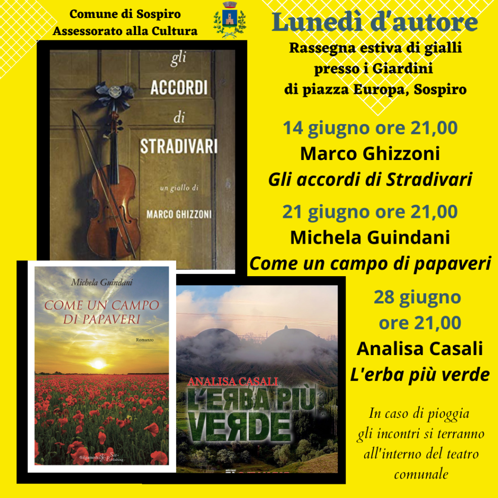 Sospiro si tinge di giallo con i “Lunedì d’autore”. Al via la rassegna di giugno dedicata ai romanzi gialli di scrittori cremonesi organizzata dall’Amministrazione comunale – Assessorato alla Cultura, a cura dell’Assessore Benedetta Fornasari, del consigliere Andrea Colla e con la collaborazione della bibliotecaria Silvia Albini.
