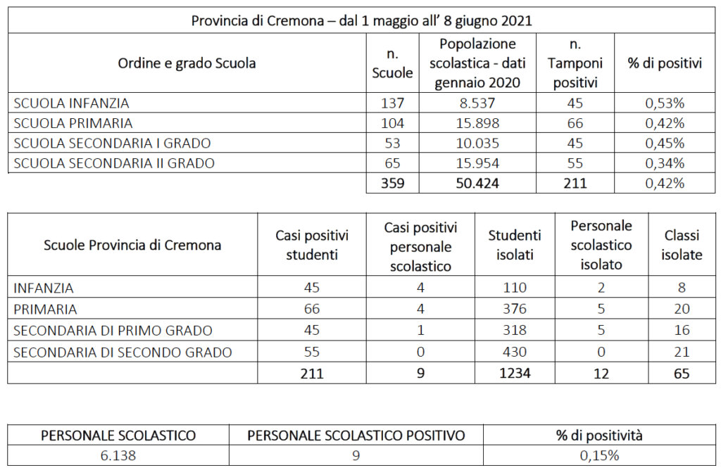 Con i 211 casi positivi registrati dal primo maggio fino alla chiusura delle scuole l’8 giugno, il numero di studenti contagiati ha raggiunto nel corso dell’anno scolastico il 4,3% della popolazione scolastica cremonese. In proporzione, i ragazzi più colpiti in questo ultimo periodo sono stati quelli che frequentano la scuola dell’infanzia.