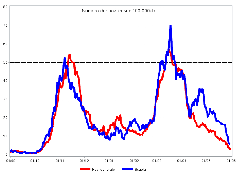 Complessivamente, i dati di incidenza (il numero di nuovi casi rapportato al numero di abitanti) confermano che l’andamento dell’epidemia nella scuola è stata sostanzialmente simile a quello della popolazione generale fino alla prima settimana di aprile. Da quel momento, che è coinciso con l’inizio della campagna vaccinale nei centri massivi e la ripresa della scuola in presenza (anche se non per tutte le scuole di ordine e grado), le due curve hanno iniziato a divergere: l’incidenza nella popolazione adulta ha continuato a diminuire mentre tra i giovani si è osservata una rapida crescita durata un paio di settimane a cui è seguito un calo repentino fino alla fine dell’anno scolastico.