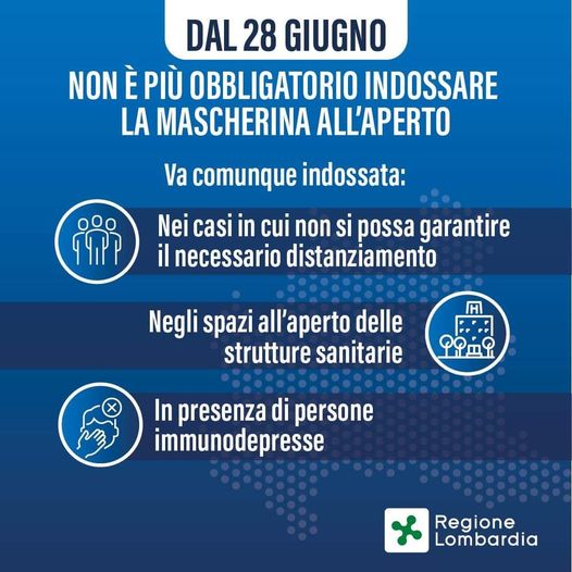 Da domani, 28 giugno, cade l’obbligo della mascherina all’aperto. “Andiamo avanti con la massima responsabilità”, avverte oggi il presidente della regione Attilio Fontana, ricordando anche che andrà comunque indossata nei casi in cui non si può mantenere il distanziamento; negli spazi all’aperto di strutture sanitarie; in presenza di persone immunodepresse.Il provvedimento riguarda solo le zone bianche (da domani lo è tutta Italia): nel caso in cui una regione dovesse tornare gialla, l’utilizzo della mascherina tornerebbe ad essere obbligatorio anche all’esterno in qualsiasi situazione.