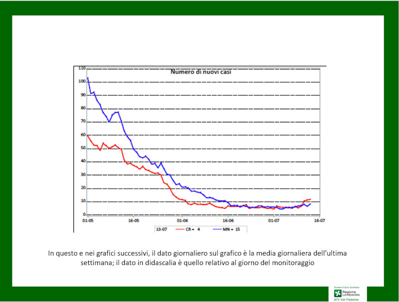L’andamento della curva dei contagi è tornato a salire dal primo luglio: questo è emerso durante l’incontro svoltosi nei giorni scorsi in Prefettura, dove l’Ats ValPadana ha illustrato i propri dati aggiornati. Numeri che non sono edificanti: se a inizio mese il numero medio dei nuovi casi giornalieri nel territorio era parecchio inferiore a 10, negli ultimi giorni ha subito un’impennata, come mostrano anche i dati di oggi (che evidenziano 34 nuovi casi positivi).