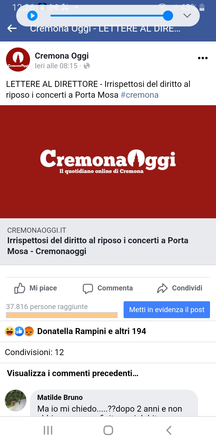 Cremona vuole tornare a vivere e recuperare quel po' di normalità che in piena estate significa anche concerti all'aperto. E' questa la sintesi degli oltre 200 commenti in poche ore, sulla pagina Facebook di Cremonaoggi, in risposta alla lettera di una residente che lamentava l'eccessiva rumorosità del concerto di Frah Quintale a Porta Mosa.