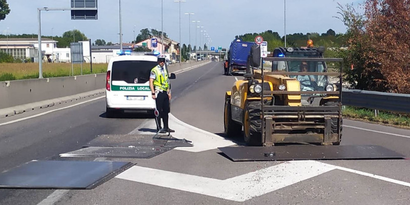 Un autoarticolato ha perso parte del suo carico oggi pomeriggio mentre percorreva via Mantova, all’altezza della rotonda di via Zaist. Varie lastre metallche sono cadute al suolo a causa di un’errata manovra del mezzo pesante che ha urtato il gard rail di cemento tra le due corsie. Sul posto due pattuglie della Polizia Locale per regolare il traffico, che tuttavia in questi giorni è molto ridotto, per cui non ci sono stati rilevanti problemi di circolazione. gb