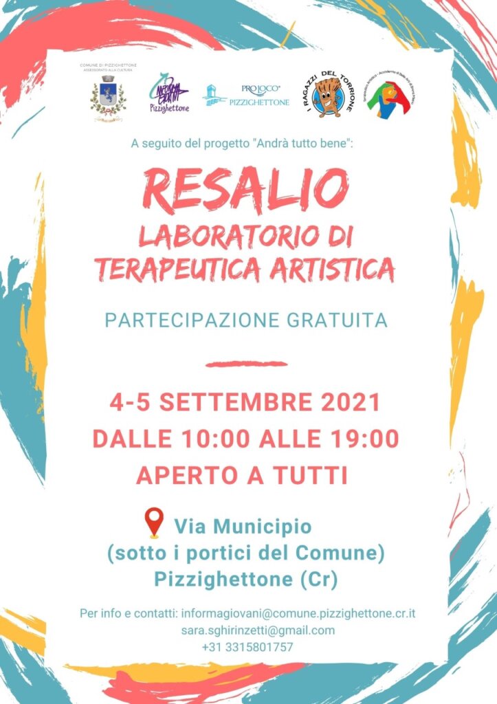 Sabato 4 e domenica 5 settembre 2021,presso i portici del Comune di Pizzighettone, dalle 10 alle 19 si terranno i laboratori di terapeutica artistica Resalio, evento patrocinato dall’Assessorato alla Cultura del Comune di Pizzighettone, con la collaborazionedel Punto Informagiovani e dell’Associazione “I Ragazzi del Torrione”. I laboratori,condotti da Sara Sghirinzetti, laureanda in Terapeutica Artistica presso l’Accademia delle Belle Arti di Brera, saranno interamente gratuiti e aperti ad adulti e bambini.