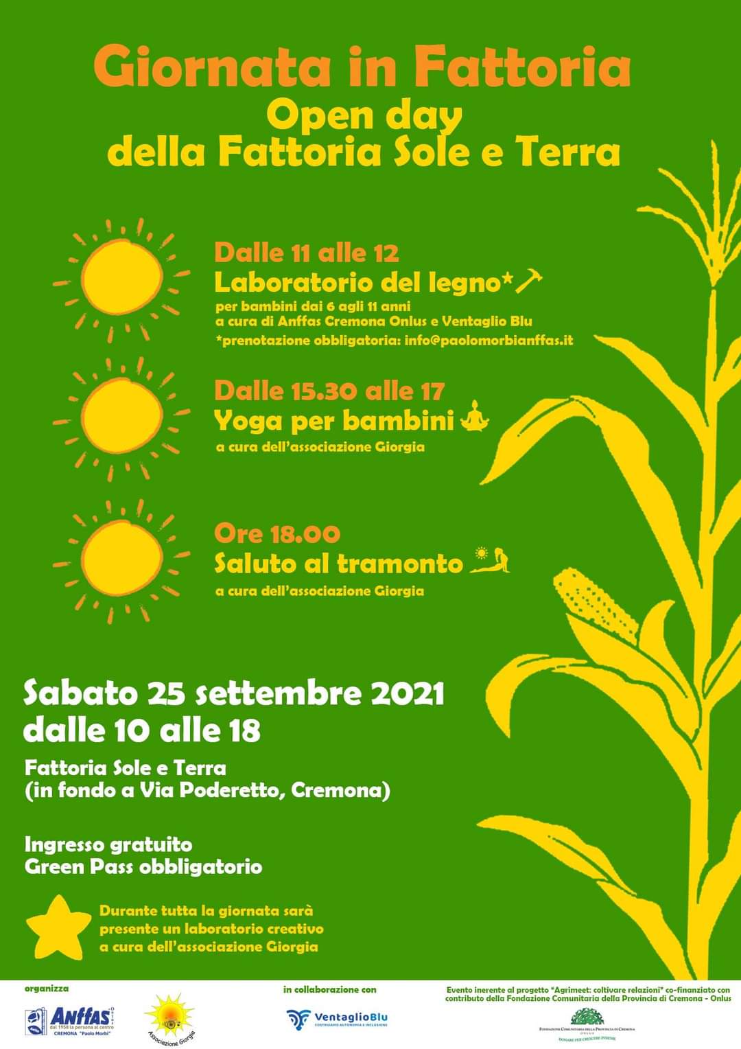 “La Fattoria – Sole e Terra” organizza per domani 25 settembre dalle 10 alle 18 negli spazi di via Poderetto, al Bosco ex Parmigiano, una giornata all’insegna della natura e del benessere in collaborazione con l’associazione Giorgia, Anffas Cremona, ventaglio Blu, e con il contributo di Fondazione Comunitaria.