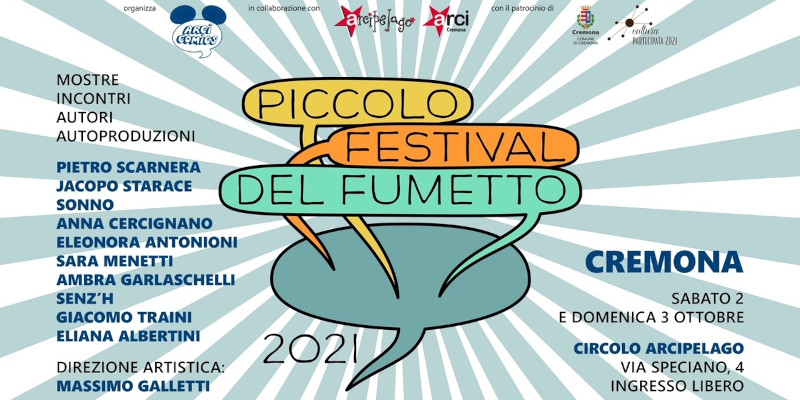 L’associazione Arcicomics promuove la quarta edizione del Piccolo Festival del Fumetto, che avrà luogo sabato 2 e domenica 3 ottobre 2021 a Cremona, presso la prestigiosa storica sede del Circolo Arcipelago, in Via Speciano 4, con incontri previsti nell’ampio spazio esterno e mostre espositive nei bellissimi saloni interni.
