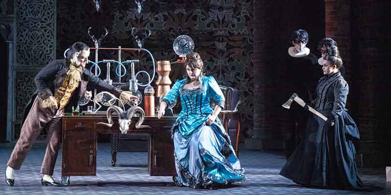 La ben nota storia del conte d’Altavilla e della sua amata Rosina, interpretati magistralmente dai giovanissimi Matteo Roma e Chiara Tirotta, è ambientata in una Siviglia notturna e oscura, con quattro onnipresenti gatti neri che fanno da musicisti, da cameriere e da paggetti, e un’atmosfera piuttosto inquietante, popolata da strani esseri e sottolineata di gesti talvolta truci dei protagonisti: da Rosina, che infilza con gli spilli una bambolina voodoo di Bartolo mentre canta “Una voce poco fa” e lancia freccette contro un bersaglio con il ritratto del tutore, o lo scheletro che don Basilio, interpretato da Alberto Comes, tiene in mano mentre intona “La calunnia è un venticello”.