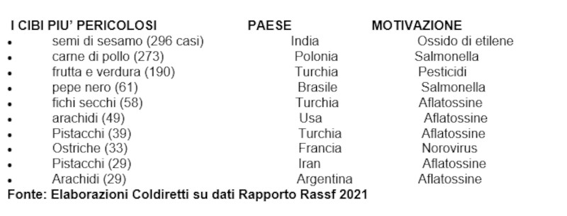 In Italia – sottolinea la Coldiretti – oltre otto allarmi alimentari su dieci sono dunque scattati a causa di cibi pericolosi provenienti dall’estero (81%).