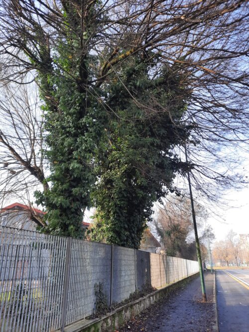 La parte rimasta in piedi è stata ripulita e si spera si riprenda. Nello stesso giardino ci sono altre piante, una che sovrasta il cancello di ingresso, due vicine al confine con la scuola primaria, altre sul confine con L’ITIS, tutte abbondantemente coperte da edera.