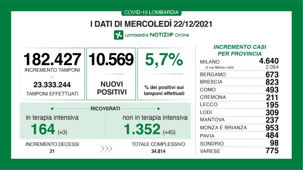 Sono 211 i nuovi casi di Coronavirus registrati in provincia di Cremona nelle ultime 24 ore. In regione, a fronte di 182.427 tamponi effettuati, sono 10.569 i nuovi positivi (5,7%). Salgono di tre i ricoveri in terapia intensiva, mentre aumentano di 45 quelli nei reparti ordinari. 21 i decessi.