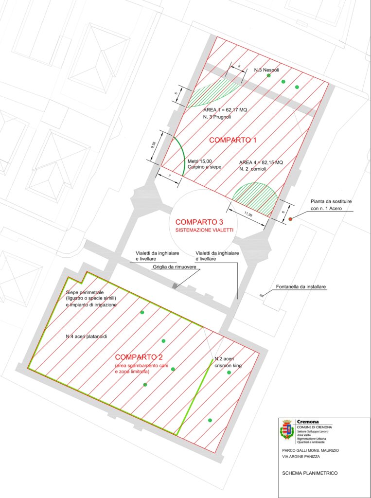 Dopo un lungo degrado, più volte segnalato, sarà riqualificato il parco intitolato a mons. Maurizio Galli, situato tra le vie Ferragni e Argine Panizza. Su proposta dell’Assessore al Verde Rodolfo Bona la Giunta oggi ha dato il via libera ai lavori. Il progetto di riqualificazione, che recepisce le richieste avanzate dal Comitato di Quartiere 9, prevede la messa a dimora di quindici nuove piante (tra le quali nespoli, prugnoli, cornioli e aceri platanoidi), saranno inoltre posate una siepe e la relativa protezione dell’area riservata allo sgambamento dei cani, che sarà dotata di impianto di irrigazione per garantire l’attecchimento della siepe. Infine, oltre alla sistemazione dei vialetti, sarà posata una nuova fontanella. Il costo complessivo dei lavori è di circa 25.000,00 Euro.