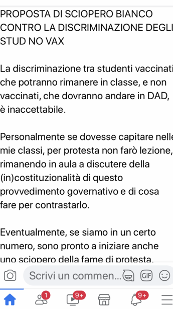 Corale la risposta dei follower del gruppo, prof e genitori “pronti a manifestare con lo sciopero della fame”, che invocando il “tutti o nessuno” sollecitano: “Rete nazionale Scuola in presenza dovrebbe promuovere qualche manifestazione”; “Occorre che una organizzazione nazionale assuma l’iniziativa”. “Il vero potere è in mano a chi gestisce le informazioni e rende note certe azioni, prese di posizione – scrive un partecipante – Bisognerebbe manifestare e manifestare in tanti. E i ragazzi in prima linea per difendere il loro futuro. Come Fatto l’anno scorso contro la Dad” perché “fanno come sempre pagare ai ragazzi, pur non avendo fatto nulla di diverso rispetto ad un anno fa….”. E così via.