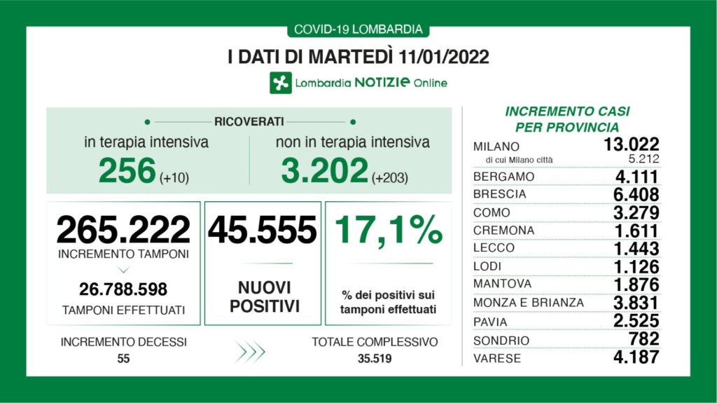 – i tamponi effettuati: 265.222, totale complessivo: 26.788.598– i nuovi casi positivi: 45.555– in terapia intensiva: 256 (+10)– i ricoverati non in terapia intensiva: 3.202 (+203)– i decessi, totale complessivo: 35.519 (+55)