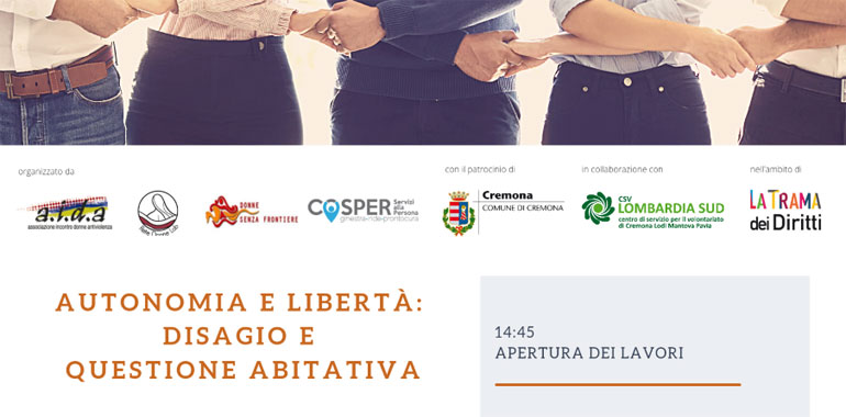 Giovedì 3 febbraio, dalle ore 14:45 alle ore 17:30, si svolgerà online, sulla piattaforma Google Meet, il seminario Autonomia e libertà: disagio e questione abitativa, organizzato da A.I.D.A. OdV – Associazione Incontro Donne Antiviolenza OdV, Rete Donne Lab OdV, Donne Senza Frontiere OdV e Cooperativa COSPER, con il patrocinio del Comune di Cremona, in collaborazione con CSV Lombardia Sud.
