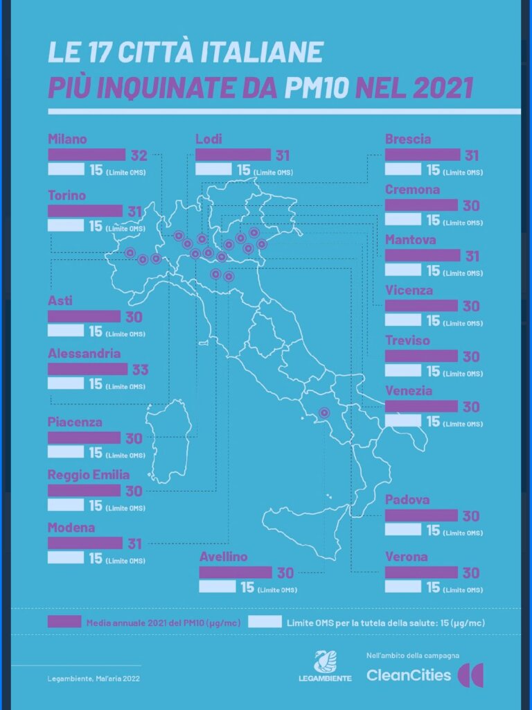 Presentato da Legambiente l’ultimo rapporto Mal’Aria di città relativo al 2021. Cremona non ne esce bene, con una media annuale di 30 microgrammi/mc di Pm10 quando il limite per la protezione della salute stabilito dall’Oms è di 15.