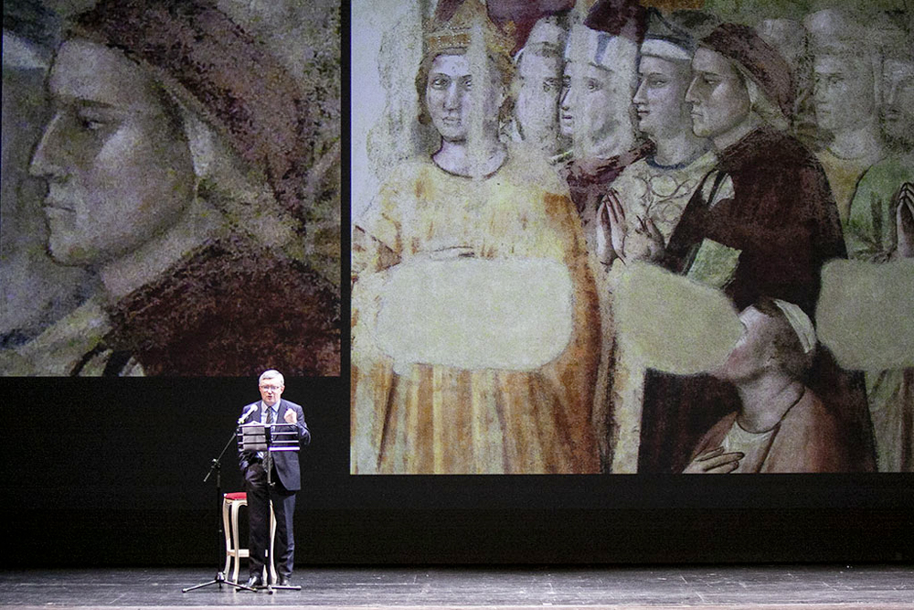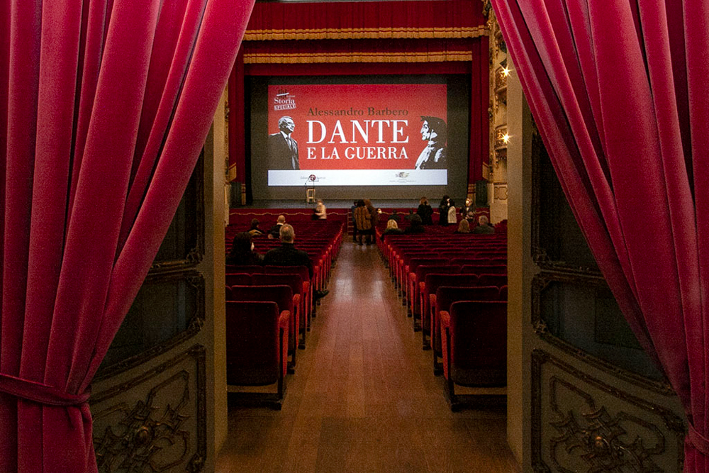 Un’ora di racconto, tra riferimenti al Convivio e agli spunti biografici offerti dalla Comedia, di cui sono stati citati alcuni passi, a cominciare dalla battaglia di Campaldino, con l’incontro con Bonconte da Montefeltro nel Purgatorio. Nella pianura sotto il castello di Pioppi il Dante 25enne combatté nella prima linea, quella degli cavalieri più forti, coraggiosi e meglio equipaggiati e le parole di Barbero ci rendono viva l’immagine dell’uomo dentro l’armatura di ferro, sopra un cavallo scalpitante (“un sogno, per gli adolescenti del Trecento, quello che oggi potrebbe essere il motorino o la prima automobile”). E ancora, il Malebolge dell’Inferno dove Dante, politico dalla parte sbagliata dopo la vittoria dei Guelfi Neri sui Bianchi, si nasconde ai demoni, impaurito come era stato durante l’assedio al castello della Caprona.
