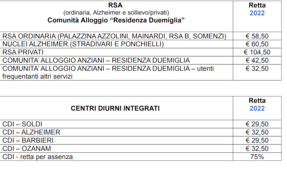 Dal punto di vista dei conti, per quanto riguarda la residenza sanitaria ordinaria e il nucleo Alzheimer, le rette verranno adeguate all’inflazione dal 1 marzo, con un aumento del 3,6% pari a 2 euro al giorno. Aumenteranno anche le rette dei centri Diurni Integrati, un euro al giorno. Fortemente ridotti per via del Covid, i centri diurni stanno rientrando nella normalità: è prevista per quest’anno un’occupazione completa dei posti solo per il Barbieri di via 11 febbraio, 40 posti; saranno invece 35 su 40 per il centro diurno Soldi di via Brescia; 15 su venti a casa Ozanam di via Milazzo.