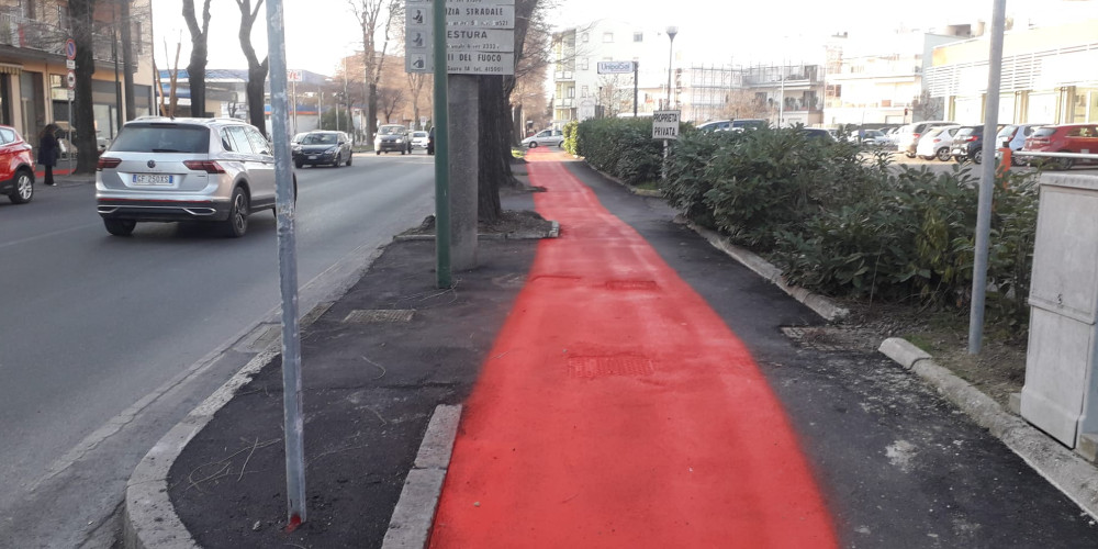 Una striscia di colore rosso lungo i marciapiedi di via Giuseppina. E’ la tanto annunciata corsia ciclabile che congiunge Via Buoso da Dovara a via Battaglione, collegandosi così ad uno dei percorsi del Biciplan cittadino.