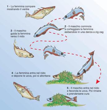 Altro rituale tipico, ma meno romantico, è quello dello spinarello (Gasterosteus aculeatus), pesce generalmente fluviale ma che vive anche nei mari a bassa salinità, come il Mar Baltico e il Mar Nero. Effettua migrazioni anadrome, migra cioè dal mare verso le acque interne dolci per riprodursi. Il maschio, che nel periodo degli amori ha una livrea con ventre e gola colorati di un rosso acceso, prepara un nido sul fondo con erbe acquatiche, quindi invita la femmina a entrarvi eseguendo una tipica danza a zig-zag, in tre tempi: si dirige verso la femmina, poi si ferma, poi si dirige verso il nido e introduce ripetutamente il capo nella sua apertura. La femmina di passaggio, attratta dai colori sgargianti del maschio e da esso guidata verso il nido, vi entra e, stimolata, depone le uova. A questo punto, il futuro padre non ha più un comportamento galante: scaccia la femmina e feconda le uova; quindi, monta la guardia al nido fino alla loro schiusa, per un periodo di circa due settimane. Ma, fino a quando gli avannotti non sono pronti a uscire, va alla ricerca di nuove partner. Ester Cecere osserva che i comportamenti riproduttivi di questa specie non sono “eticamente” corretti, diremmo noi umani, poiché i maschi tentano di fecondare le uova deposte nel nido realizzato da altri e, a tale scopo, vanno incontro a una sorta di metamorfosi grazie alla quale il colore della loro livrea cambia ed essi finiscono per rassomigliare alle femmine. (I rituali di corteggiamento più strani degli animali (kodami.it).