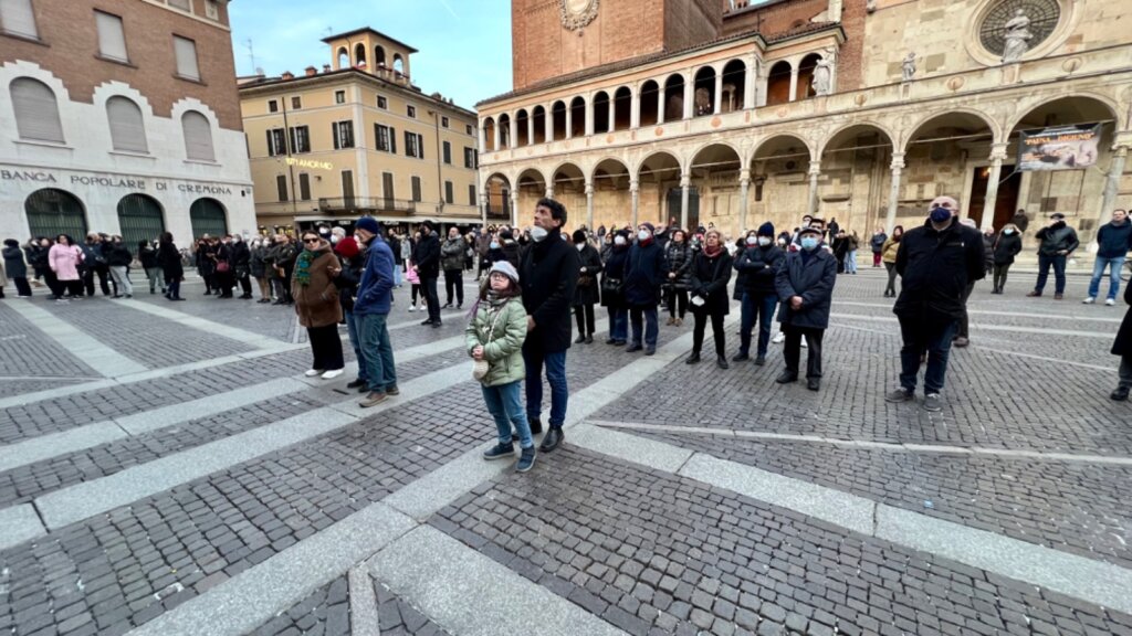 Un momento di vicinanza alla tragedia che sta vivendo l’Ucraina, alle tantissime vittime civili, alla distruzione di edifici, ospedali, infrastrutture. Anche Cremona ha aderito all’iniziativa promossa dalle città europee di Eurocities per dire no alla guerra. Il breve e toccante momento è andato in scena nel pomeriggio in piazza del Comune, dove è stata esposta la bandiera ucraina ed eseguito l’inno nazionale ucraino da parte della cantante Tetiana Petriv, soprano, allieva del conservatorio cittadino. Esposta anche la bandiera della pace realizzata in questi giorni dai bambini della scuola per l’infanzia Zucchi.