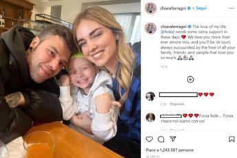 (Adnkronos) – Dopo le parole di Fedez sulla malattia, Chiara Ferragni dedica su Instagram un post al marito: ”L’amore della mia vita ha bisogno di un supporto in più in questi giorni. Ti amiamo più che mai amore mio e presto starai bene, sempre circondato dall’amore di tutta la tua famiglia, dei tuoi amici e delle persone che ti amano tanto”, scrive l’influencer, che pubblica uno scatto che la ritrae sorridente assieme a Fedez e al figlio Leone.