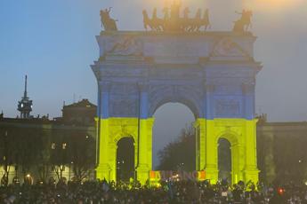 Ucraina, Arco della pace Milano si tinge di blu e giallo, 10mila per la pace