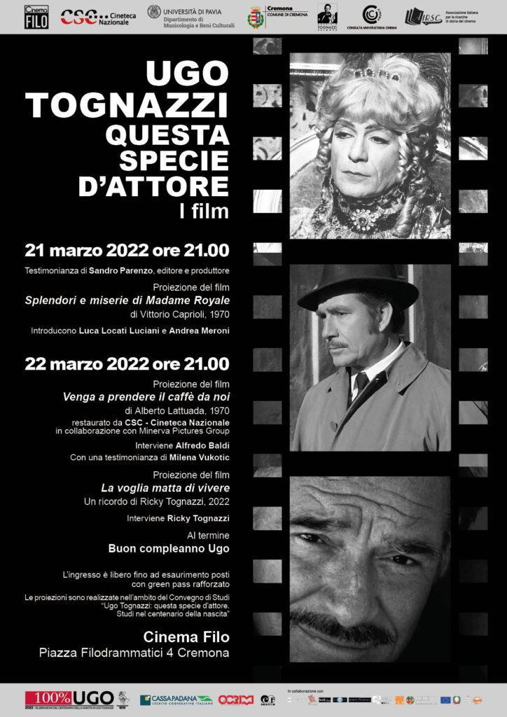 I manifesti dei suoi lungometraggi più iconici hanno addobbato il Dipartimento di Musicologia e Beni Culturali dell’Università di Pavia sede di Cremona, che ha ospitato il convegno curato dalla professoressa Elena Mosconi richiamando in città studiosi internazionali: protagonista Ugo Tognazzi nel centenario della nascita che ricorre il 23 marzo e si celebra con un ventaglio di eventi, cui partecipano in videocollegamento anche i famigliari dell’attore. Presenti in sala diversi rappresentanti del Comune di Cremona che ha promosso le iniziative per la rassegna “100%UGO” in sinergia con il Comitato nazionale.
