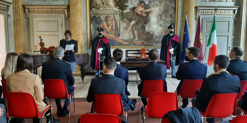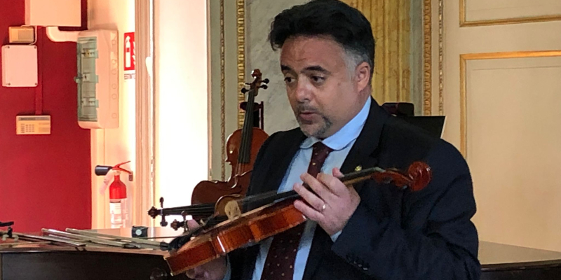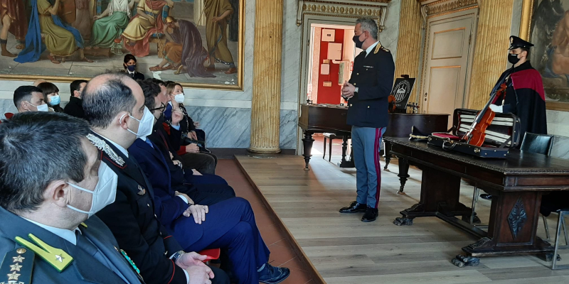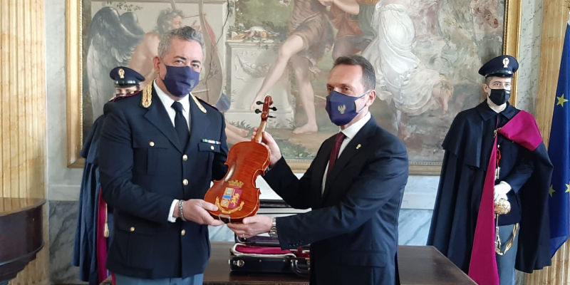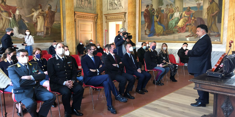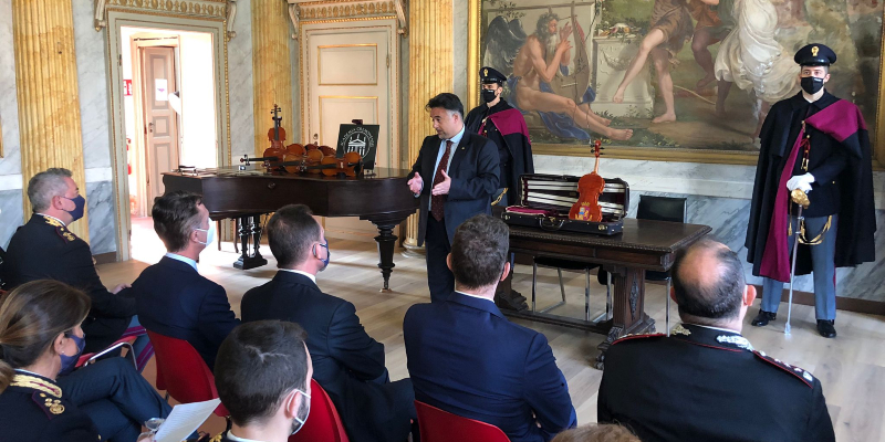 Un omaggio alle istituzioni da parte della città. Così questa mattina nelle sale dell’Academia Cremonensis di via Platina sono partite le note del violino che il professor Fabio Perrone, dell’Academia Cremonensis, alla presenza del prefetto Corrado Conforto Galli e delle autorità militari, ha consegnato nelle mani del questore Michele Sinigaglia e del maestro Maurizio Billi, direttore della Banda Musicale della Polizia di Stato, per onorare il 170° anniversario di fondazione, e per un ringraziamento al lavoro svolto in questi difficili anni di pandemia a tutela dei cittadini per garantire a tutti, senza mai risparmiarsi, la sicurezza e la possibilità di vivere il più serenamente possibile.