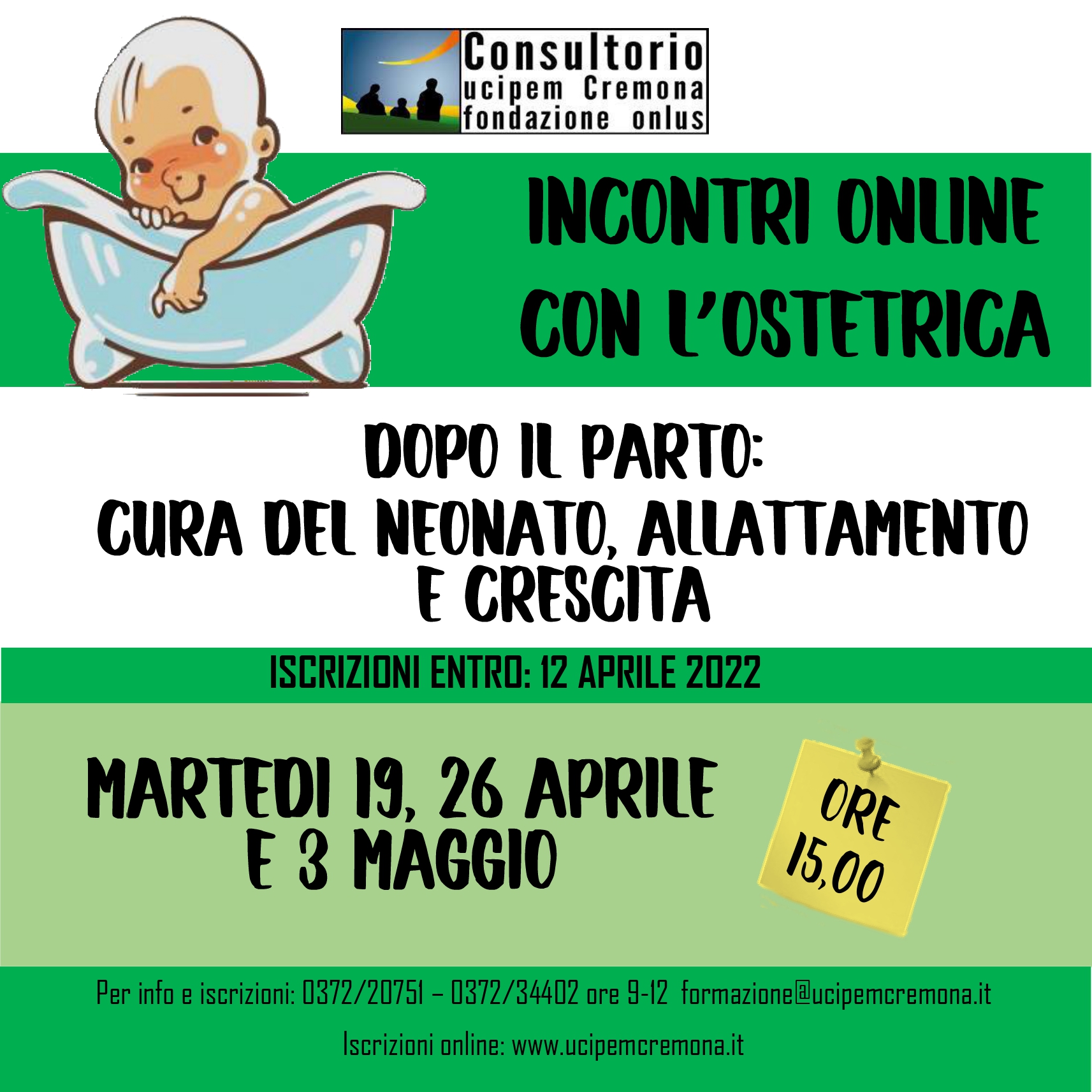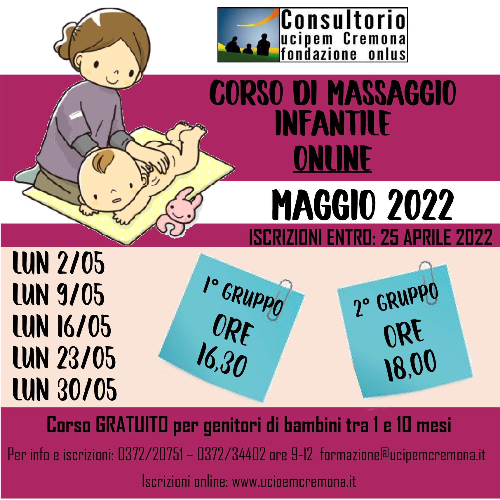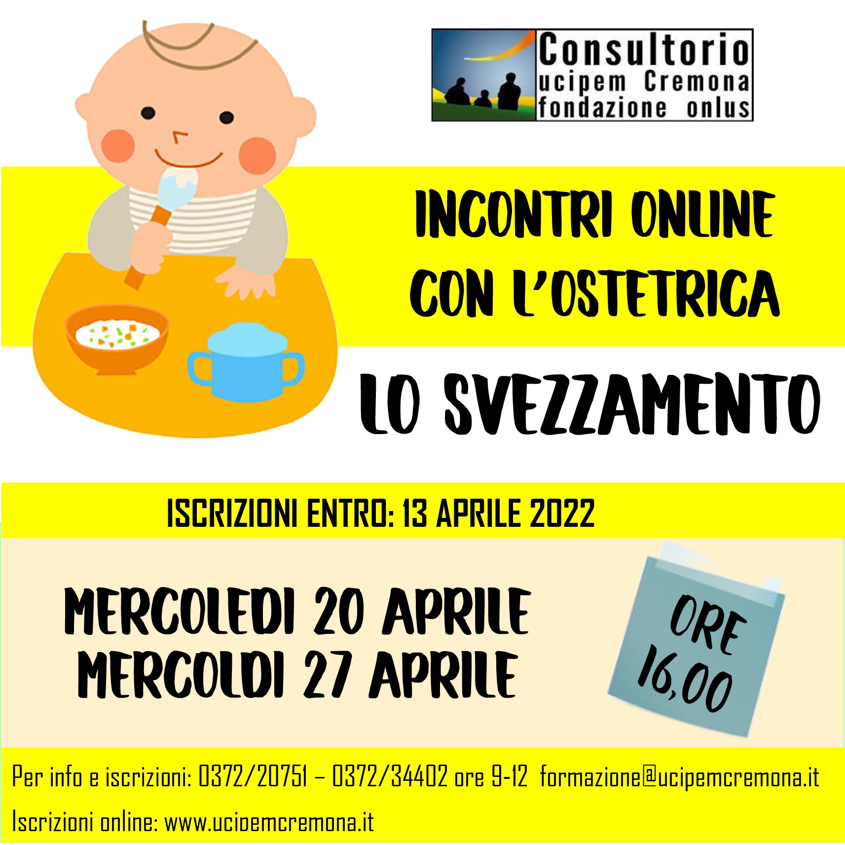 Tre incontri gratuiti in cui genitori e operatori del Consultorio UCIPEM – Fondazione Onlus si confrontano intorno alle esigenze evolutive dei figli e all’importanza del ruolo genitoriale in un tempo di profondi cambiamenti e riorganizzazioni, passaggi e scelte, fatiche e potenzialità. Le attività si svolgeranno in presenza nel Consultorio Ucipem via Milano 5/C a Cremona. Accesso con green pass, l’iniziativa è organizzata all’interno del progetto “Hug: proteggi ciò che ami”. Iscrizioni online sul sito www.ucipemcremona.it. Per informazioni scrivere a formazione@ucipemcremona.it o telefonare ai numeri 0372 20751 e 0372 34402 da lunedì a venerdì (ore 9.00 – 12.00) e lunedì, martedì e mercoledì (ore 15.00 – 18.00).