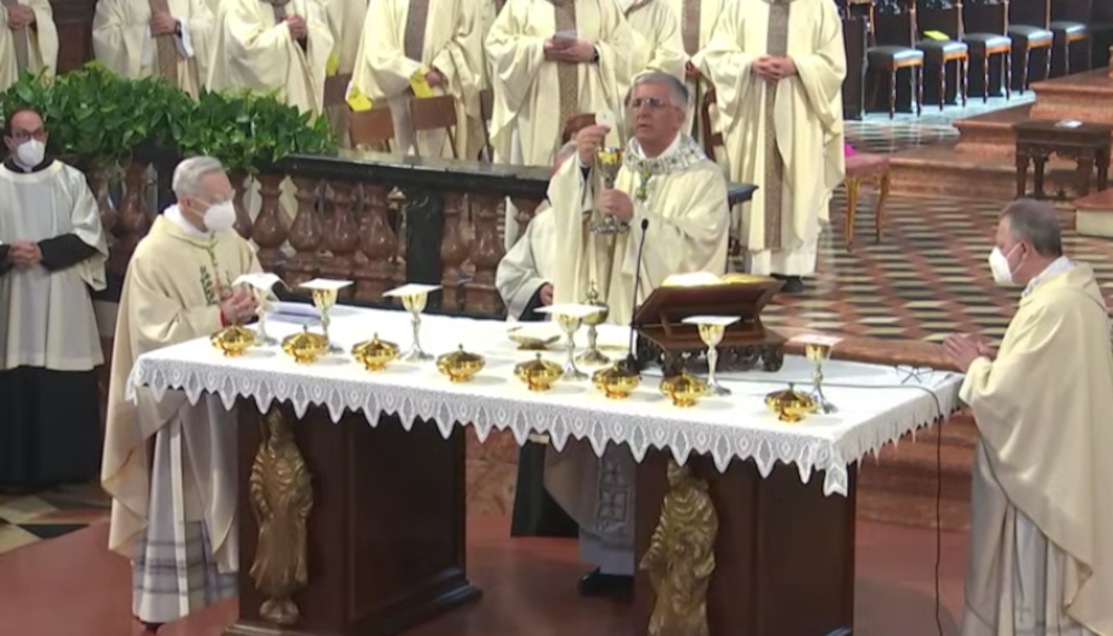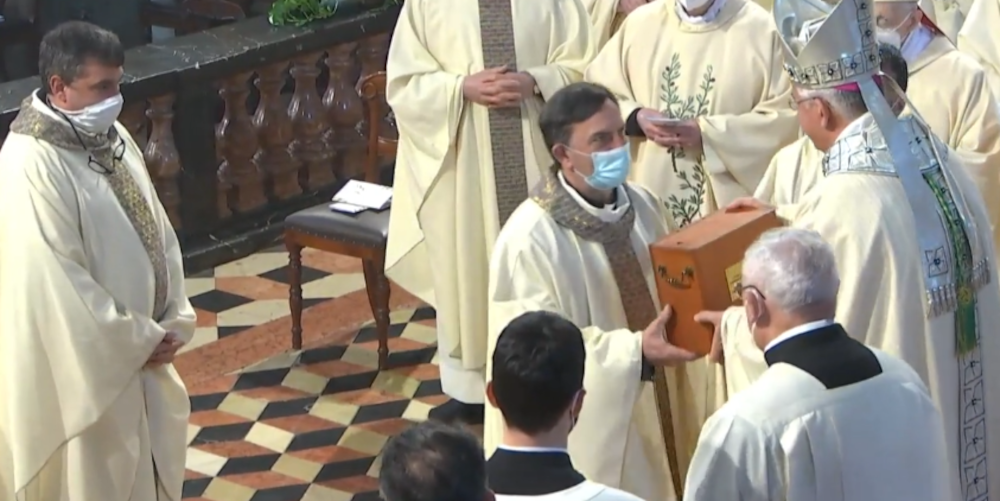Il vescovo ha quindi consegnato ai vicari zonali le cassette con le ampolle contenenti l’olio benedetto, per essere distribuite alle parrocchie. Per ragioni precauzionali, anche quest’anno non si terrà il pranzo conviviale in seminario: appuntamento rimandato, si spera, a maggio.