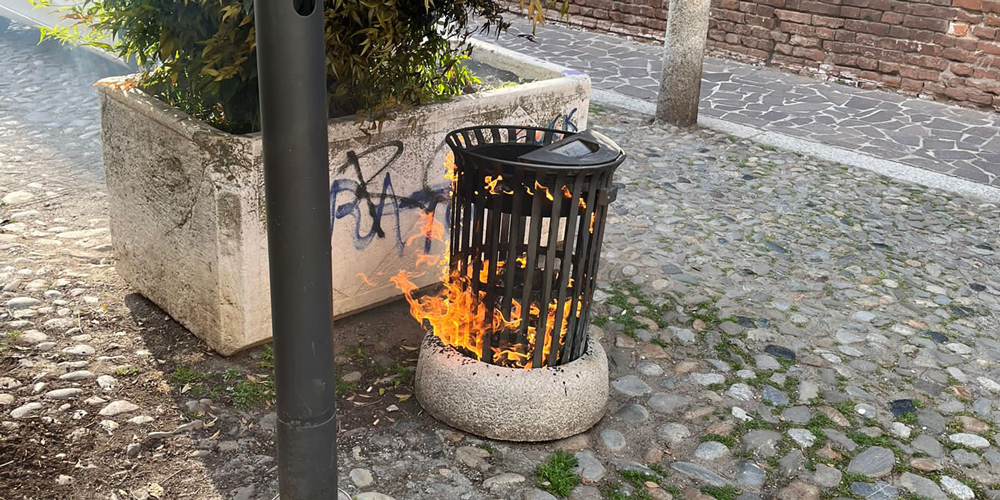 Cestino della spazzatura in fiamme nel pomeriggio di sabato in piazza Sant’Agostino, dove spesso bande di ragazzini si radunano creando scompiglio e lasciando sporcizia ovunque. Una situazione di cui spesso i residenti si lamentano, ma che sembra non trovare una soluzione.