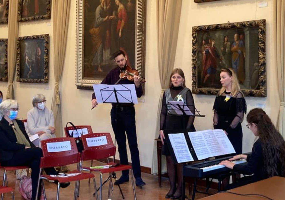 I tre studenti si sono poi esibiti in un momento musicale accompagnati al pianoforte da Elisabetta Chiarato, che ha visto l’esecuzione dell’Ave Maria di Giuseppe Verdi e di brani di Myroslav Skoryk e Antonín Dvorák, per finire con una canzone popolare ucraina. E’ stato chiesto il bis e l’hanno concesso: l’inno nazionale ucraino.