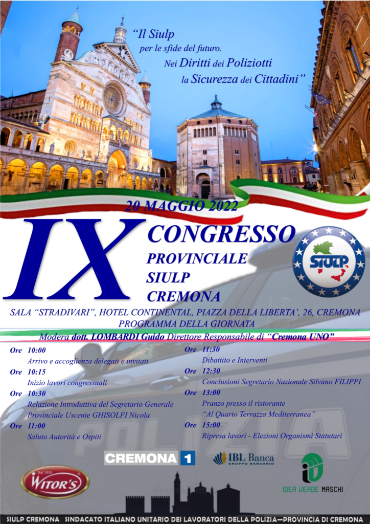 Il sindacato di Polizia Siulp (Sindacato italiano unitario dei lavoratori della Polizia) della provincia di Cremona si riunirà domani mattina dalle ore 10 all’hotel Continental per il nono congresso provinciale.