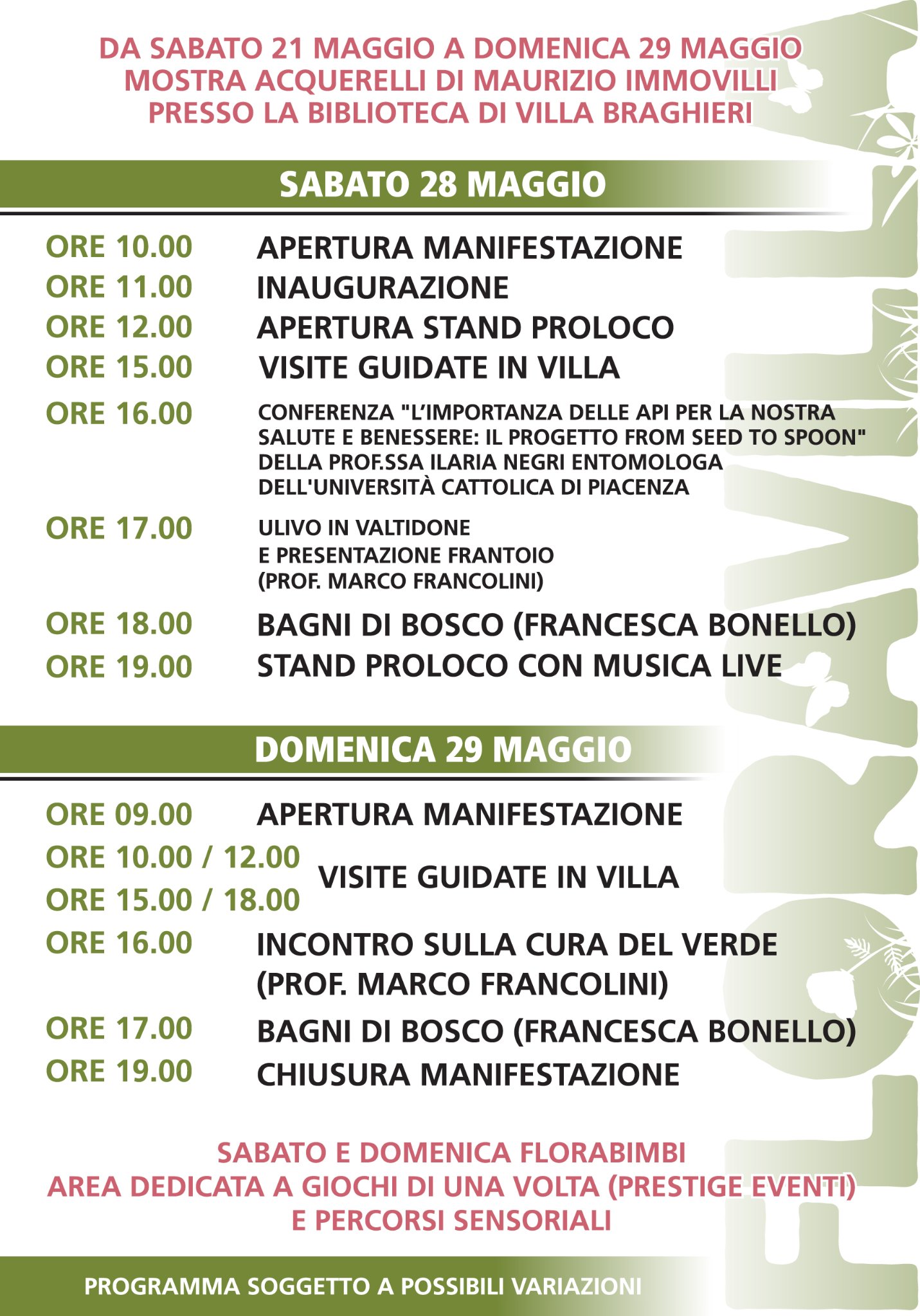 Sabato 28 e domenica 29 maggio torna Floravilla nel parco di Villa Braghieri a Castel San Giovanni in provincia di Piacenza. Si tratta di una mostra mercato di fiori e piante da giardino, visite guidate in villa, incontri culturali, mostra di acquerelli, percorsi sensoriali e florabimbi area dedicata ai giochi di una volta. Previsto anche uno stand gastronomico con cena e musica il sabato sera.