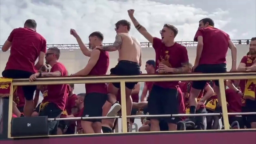 Dopo il trionfo di Tirana nella finale della Conference League contro il Feyenoord, la Roma sfila per le strade della città su bus scoperti e tra migliaia di tifosi.