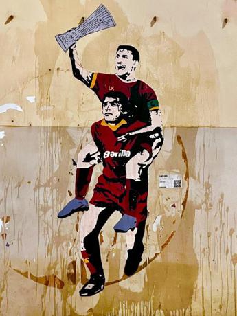(Adnkronos) – La notte tra il 26 ed il 27 maggio, a Roma in piazza Testaccio, è apparsa una nuova opera della Street Artist Laika, dal titolo “Un calcio alle paure (1984-2022)”. Il poster raffigura il compianto capitano della Roma Agostino Di Bartolomei in festa, che porta sulle sue spalle il capitano della Roma del 2022, Lorenzo Pellegrini, che tiene in mano la Coppa Conference League, appena vinta dai giallorossi.
