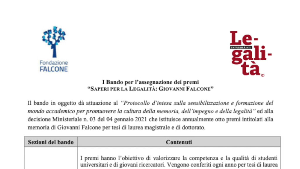 Torna il premio “Saperi per la Legalità: Giovanni Falcone”. A lanciare la nuova edizione il ministro dell’Università e della Ricerca, Maria Cristina Messa, e la presidente della Fondazione Giovanni Falcone, Maria Falcone, in occasione del trentesimo anniversario delle stragi di Capaci e via D’Amelio. Il premio quest’anno è aperto anche agli istituti dell’alta formazione artistica, musicale e coreutica.