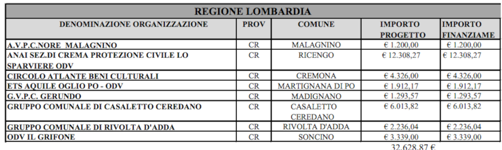 Ammontano a 2,5 milioni le risorse destinate a Regione Lombardia per i gruppi di volontari di Protezione civile di tutte le province del territorio (di cui 537.684,44 in capo a Regione Lombardia). A Cremona (8 dipartimenti) saranno assegnati 32.628,87 euro, così suddivisi: