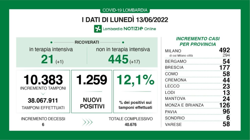 Cresce ancora l’indice di positità al Covid in Lombardia e in provincia di Cremona (12,6%), dove i casi nelle ultime 24 ore sono 44. I nuovi casi positivi in regione sono 1.259, e crescono anche i ricoveri: in terapia intensiva ci sono 21 pazienti (+1) mentre in altri reparti se ne contano 445 (+17). I decessi raggiungono quota 40.676 (+6).