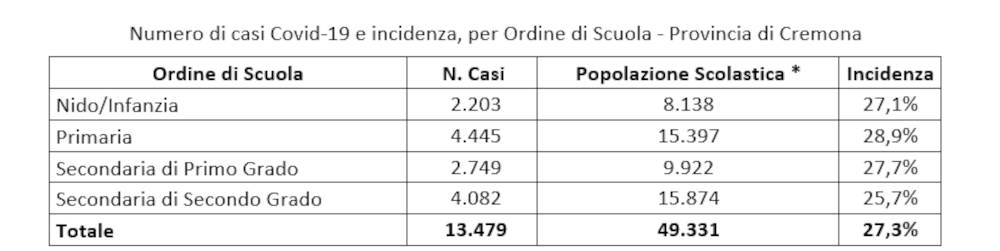 “Dal report curato dall’Osservatorio Epidemiologico di ATS Val Padana diretto dal Dott. Marco Villa, si evince che complessivamente, in tutta l’ATS, 30.703 alunni hanno contratto il Covid-19, per un’incidenza stimata al 28,6%. Andando più nel dettaglio per i vari ordini di scuola, il numero assoluto dei contagi, rapportato alla popolazione scolastica corrispondente per fasce d’età, ha interessato principalmente la scuola primaria con 9.979 casi (il 29,5% della popolazione in questa fascia d’età), la scuola secondaria di secondo grado con 9.502 casi (27,6%) e a seguire, la scuola secondaria di primo grado con 6.478 casi (30%) e la scuola per l’infanzia con 4.744 casi (26,8%). Si evince pertanto che, rispetto alla popolazione di riferimento, il virus è circolato maggiormente tra gli alunni delle scuole primarie e delle scuole secondarie di primo grado e che la curva dei contagi ha raggiunto il picco nel mese di gennaio 2022.”
