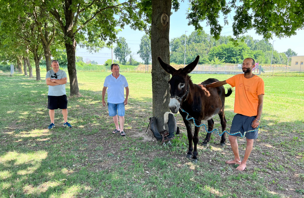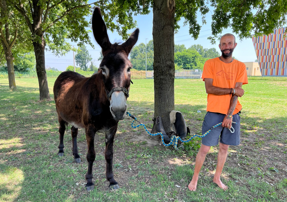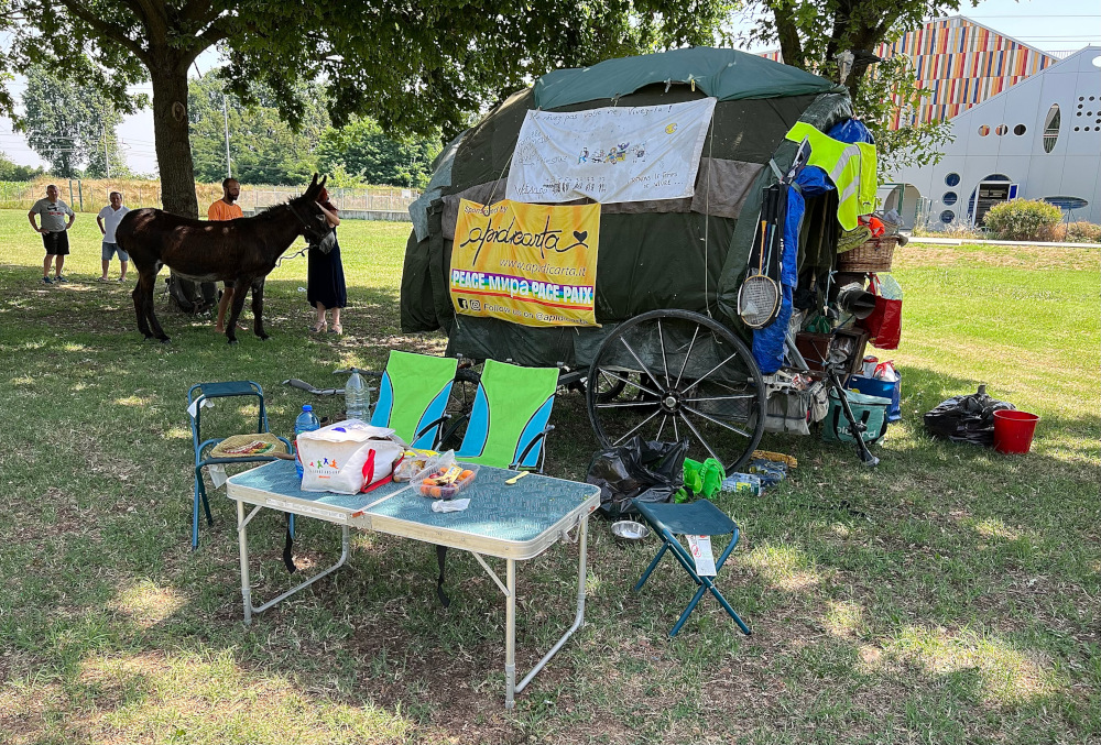 Un carretto in legno, costruito a mano, un asino di 20 anni, una famiglia di sei persone, di cui 4 bambini, e un cane: uno spettacolo insolito quello che si sono visti davanti questa mattina i residenti di Malagnino, dove è approdata la curiosa comitiva, proveniente dal cuore della Francia. Yousef , il padre, falegname, Matilde, la madre, che ha lavorato per il cinema, e i loro quattro figli: Noon, Jood, Ninawa e Jal accompagnati dal cane Jafar e dall’asinella Nina.