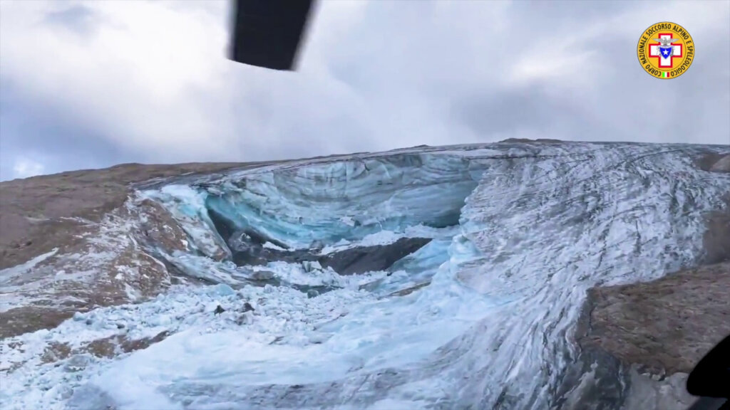 Nelle immagini aeree del Corpo nazionale del soccorso alpino e speleologico si vede come appare oggi l’area del ghiacciaio della Marmolada dopo il crollo di domenica 3 luglio che ha causato almeno 7 morti, 8 feriti e 5 dispersi.