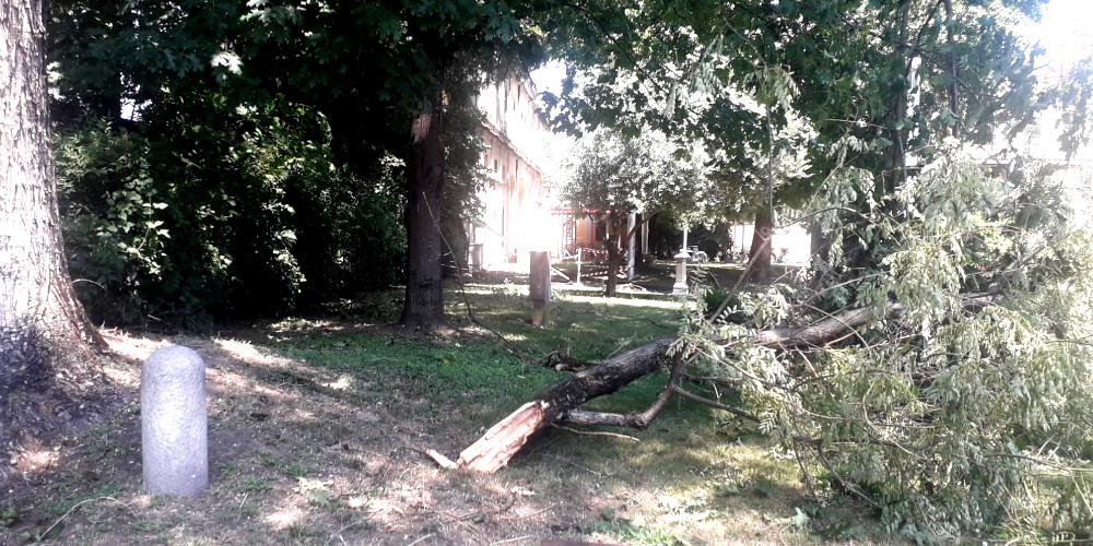 Con il passare dei giorni diventa sempre più chiaro l’impatto della tromba d’aria del 4 luglio sulla città. Non solo alberi, su cui i vigili del fuoco stanno intervenendo anche oggi un po’ in tutti i quartieri e nei comuni limitrofi, ma anche edifici. Nel piazzale della stazione, la copertura in lamiera di uno stabile di servizio di Rfi è stata divelta dal vento ed è piombata sul muretto di cinta che divide questa area interna dall’aiuola del piazzale. Un impatto violento, che ha mandato in frantumi la sommità del muro. Nella stessa aiuola poco distante, il vento ha causato anche il il distacco di un grosso ramo. L’area è al momento recintata.